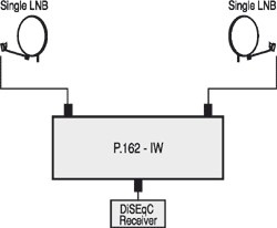 - DiSEqC 2.0 prepínač slúži na pripojenie 2 satelitných pozícii(2x single LNB) a 1 uživateľa