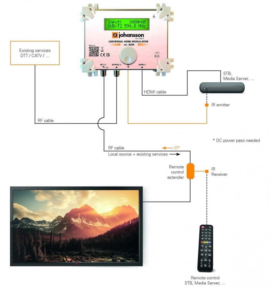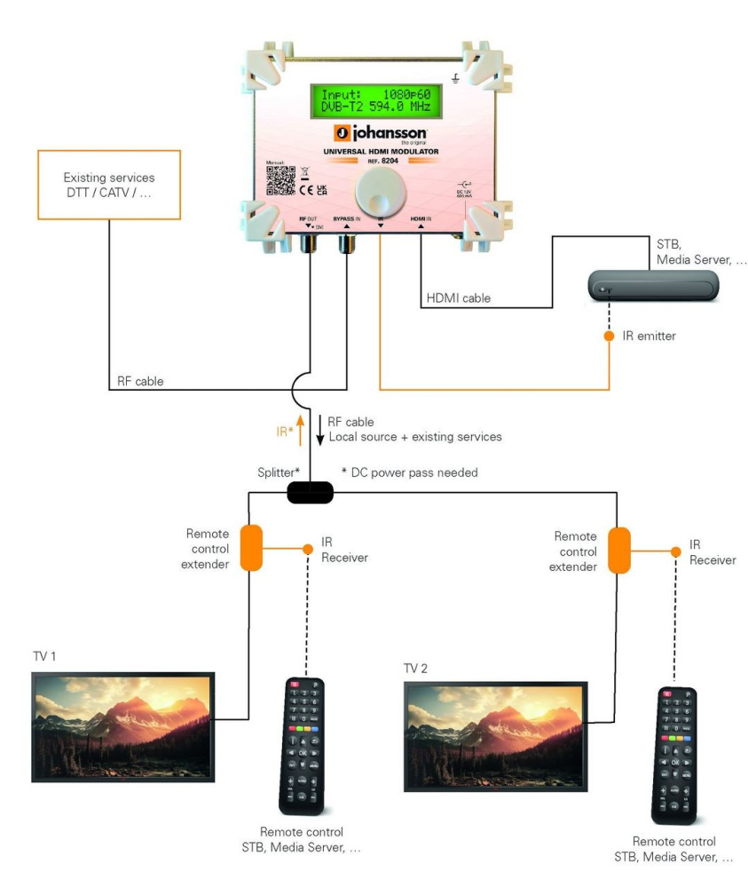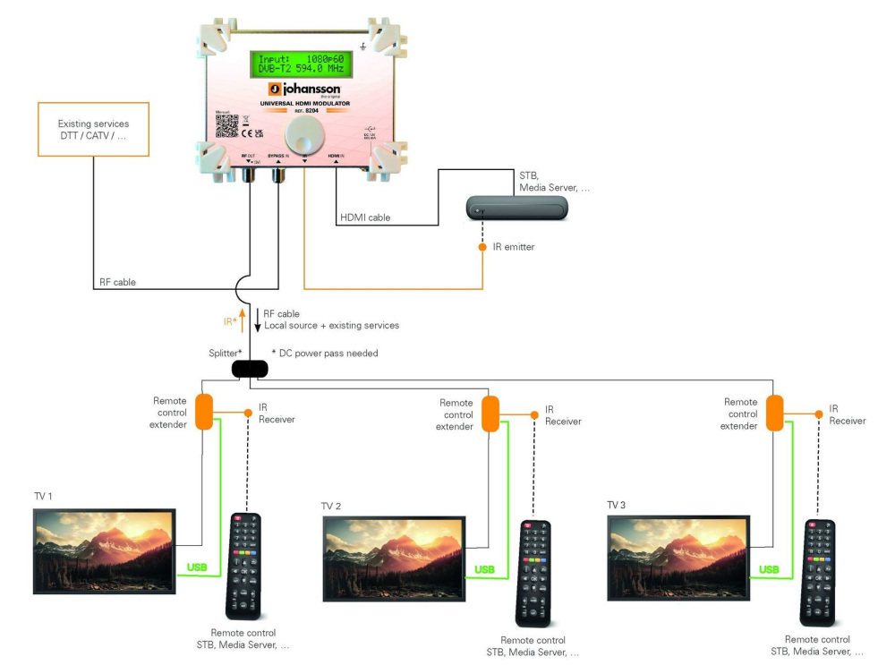 - Sada je prijímač a vysielač pre modulátor Johasson 8204, ktorým zabezpečíte prenos IR povelov od pripojeného zariadenia do vstupu modulátora HDMI