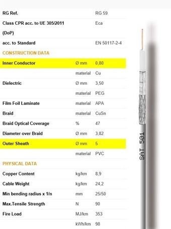 - Vnútorný vodič: priem. 0,80mm; materiál Cu