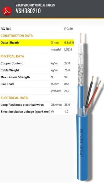 - Koaxiálny kábel v prevedení LSZH ktorý obsahuje dvojlinku pre napájanie kamery.